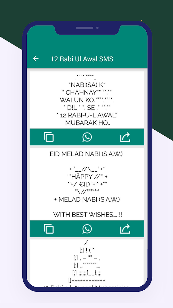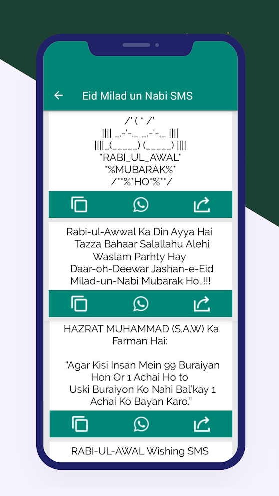 Send Mobile short message 12 RABI-U-L AWAL Mubarak Ho from the islamic collection of SMS and text messages. Simply copy this message and send via WhatsApp, SMS, Facebook Status, Tweet, Instagram or any other social platform you like. There is a huge collection of islamic messages available on our website, which you can send to your family & friends. Simply browse through our collection and enjoy the quotes, wishes and greetings written in short messages for mobiles & social media usage.